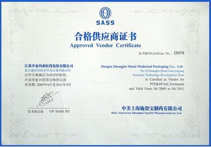 近日,我公司被中美上海施貴寶制藥有限公司評為2009-2011年度合格供應商,并頒發(fā)證書。
