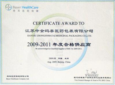 8月28日,在拜耳醫藥保健有限公司召開的供應商大會上,江蘇中金瑪泰醫藥包裝有限公司被評為“2009-2011年度合格供應商”,并頒發證書。