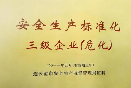 連云港本一化工有限公司自2009年9月開展安全生產標準化工作以來,認真對照安全標準化各項工作要求,組織資料編寫標準化手冊和程序文件及相關操作規程和規章制度等文件,并對員工進行相關培訓,對存在的安全隱患和薄弱環節多次進行整改和改造,經過近一年半的運行,于今年4月份組織對本一化工申報的三級危險化學品從業單位安全標準化進行考評驗收,專家考評組對照危險化學品從業單位安全標準化標準進行考評檢查,現場認定本一化工達到安全生產標準化危險化學品企業三級安全企業標準。