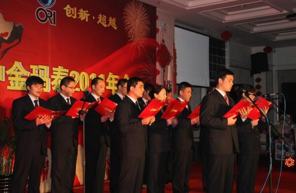 年會伊始,公司總經理徐根華代表公司董事會、經營層向一年來,為公司的發展而辛勤工作、努力奮斗的全體員工,致以新春的祝福。隨后徐總做《2011年工作總結及2012年工作計劃》的報告。他從六個方面回顧了2011年的各項工作,徐總指出,2011年是中金瑪泰發展進程中極不平凡的一年,是中金人迎接挑戰、各項事業不斷取得新業績的一年。一年來,在面對復雜多變的國內外經濟形勢,公司上下齊心協力,克服了生產成本持續上漲、人民幣升值加速、市場競爭形勢惡化以及塑化劑事件等諸多不利因素的影響,較好地完成年初下達的各項經營預算指標,企業各項工作也取得了可喜的經營成績,企業實現了持續、穩步發展的目標。