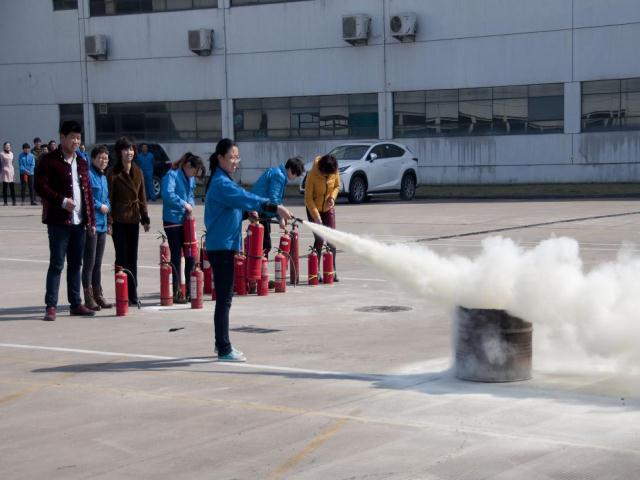 為了讓消防知識深入人心,培訓課程結束后,公司安全科長楊正濤在室外場地就滅火器材及防護裝備的使用進行了現場的示范與演練,同時對初起火災撲救方法以及火災發生后如何報火警、如何安全疏散和自救逃生等安全常識進行了詳細的解說,并在現場讓公司員工親身體驗了一次滅火實戰演練過程。在隨后的各工廠應急演練疏散過程中,當消防警報突然響起,各區域安全負責人立即組織本區域人員井然有序地按照規定疏散路線,迅速撤離現場,到達指定地點,出色的完成了疏散逃生演練。