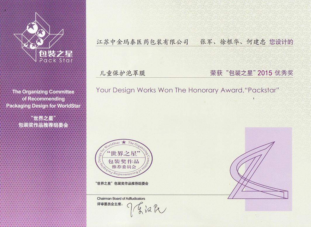 日前,本公司自行研發的新產品“兒童保護泡罩膜”榮獲“世界之星包裝獎推薦委員會”頒發的“包裝之星”優秀獎。