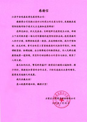 4月20日,中金瑪泰收到一封來(lái)自石家莊以嶺藥業(yè)的感謝信,感謝中金瑪泰在疫情防控期間給予以嶺藥業(yè)的大力支持和幫助。信中提到 “在抗擊疫情的關(guān)鍵時(shí)期,我們守望相助、共克時(shí)艱,中金瑪泰全體員工冒著被感染的風(fēng)險(xiǎn)堅(jiān)守崗位,積極調(diào)配貨源、協(xié)調(diào)運(yùn)輸,全力保障以嶺藥業(yè)的物資供應(yīng),為人民群眾健康筑起第一道防線,用實(shí)際行動(dòng)詮釋企業(yè)的責(zé)任與擔(dān)當(dāng),彰顯了人間大愛。”